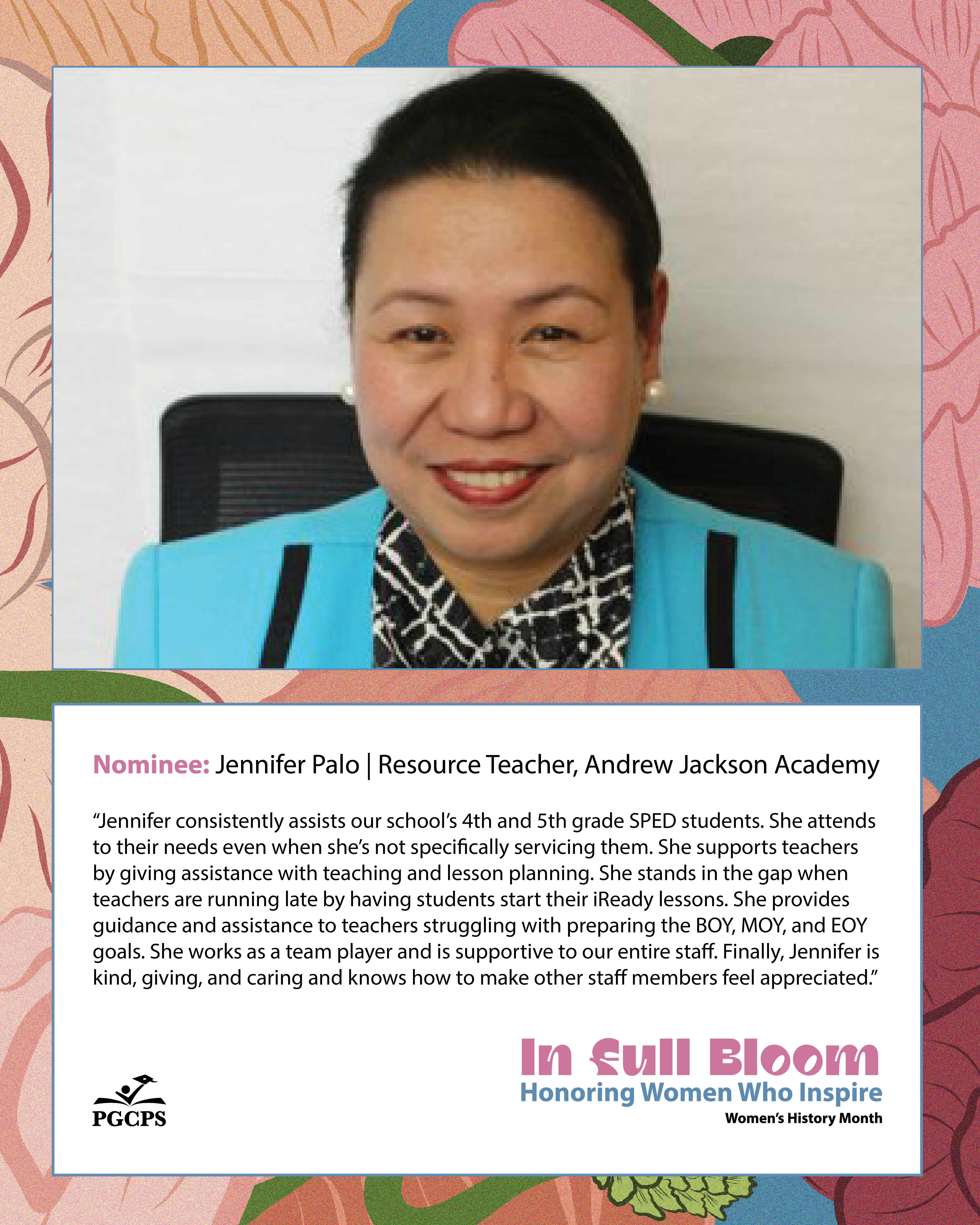 “Jennifer consistently assists our school's 4th and 5th grade SPED students.She attends to their needs even when she's not specifically servicing them. She supports teachers by giving assistance with teaching and lesson planning. She stands in the gap when teachers are running late by having students start their iReady lessons. She provides guidance and assistance to teachers struggling with preparing the BOY, MOY, and EOY goals. She works as a teamplayer and is supportive to our entire staff. Finally, Jennifer is kind, giving, and caring and knows how to make other staff members feel appreciated.”