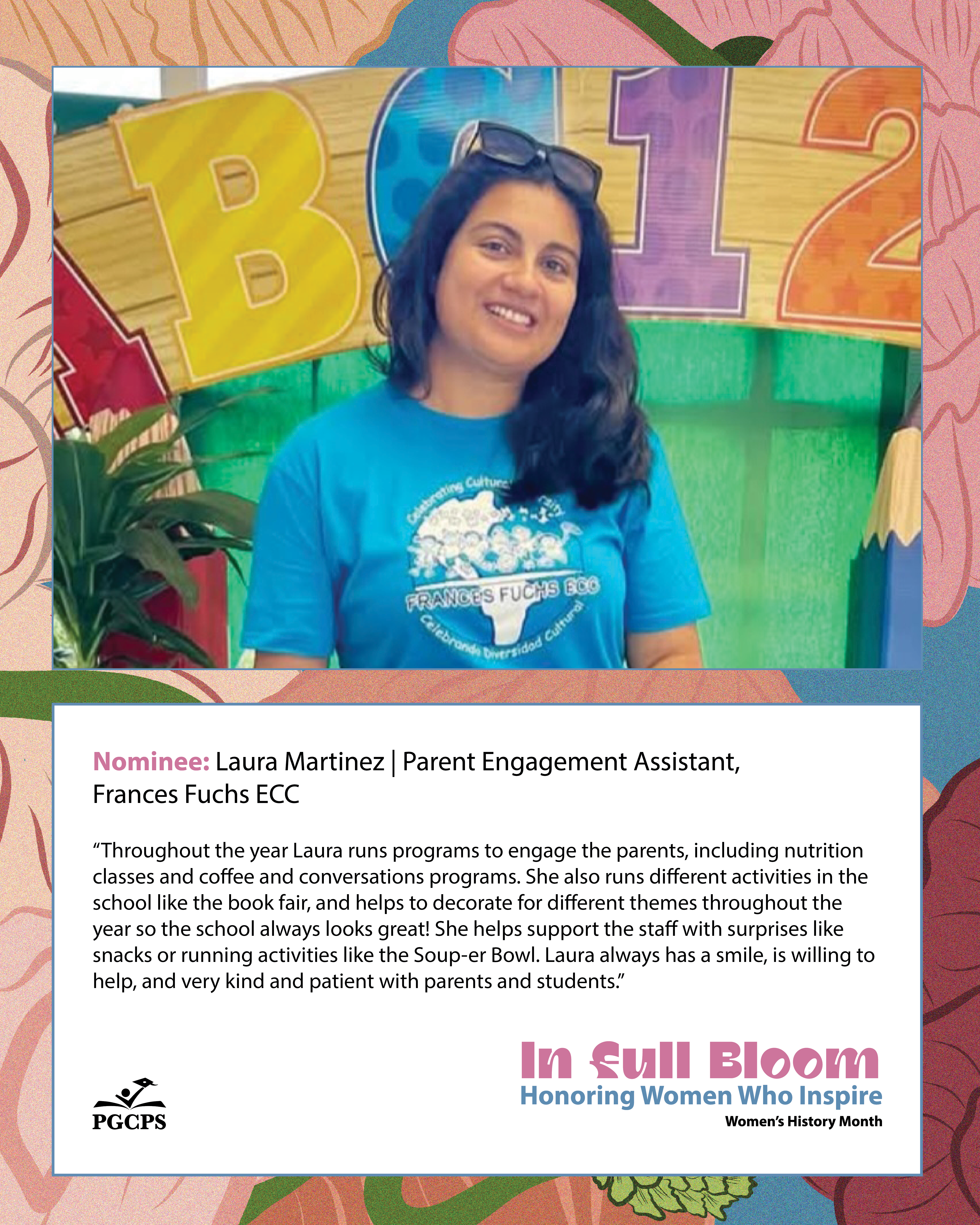 “Throughout the year Laura runs programs to engage the parents, including nutrition classes and coffee and conversations programs. She also runs different activities in the school like the book fair, and helps to decorate for different themes throughout the year so the school always looks great! She helps support the staff with surprises like snacks or running activities like the Soup-er Bowl. Laura always has a smile, is willing to help, and very kind and patient with parents and students.”