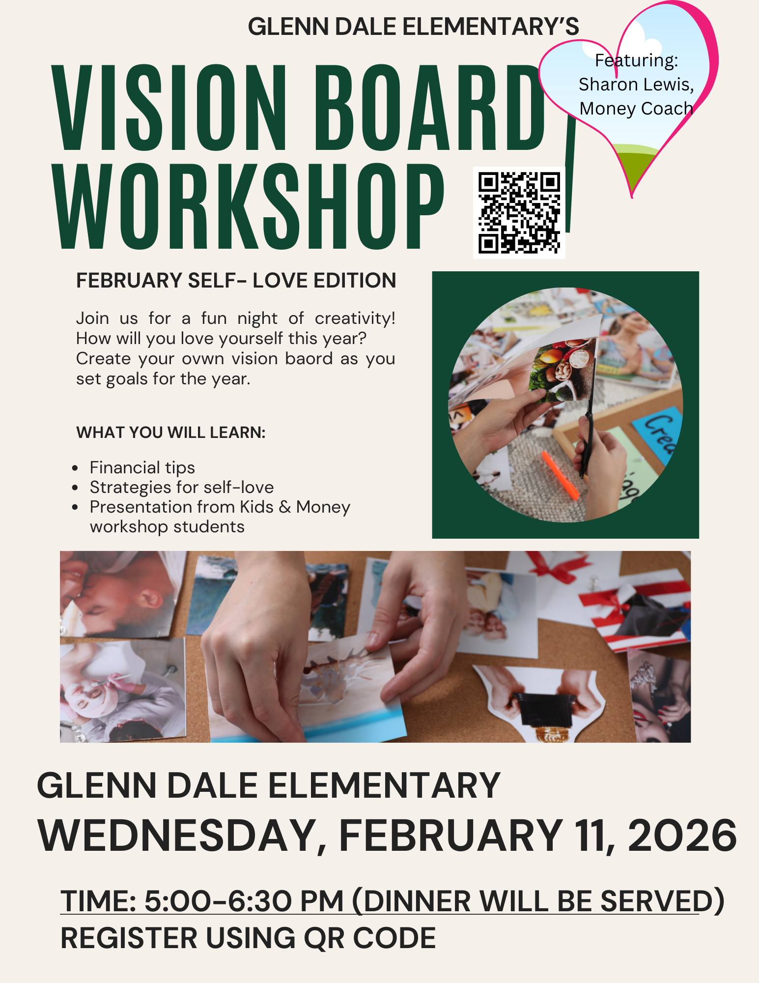 Join us for our Vision Board Workshop on February 11 from 5:00pm-6:30pm. How will you love yourself this year? Create your own vision board as you set goals for the year. Learn about financial tips and help kids with money. Dinner will be served! Register using the QR code on the flyer.